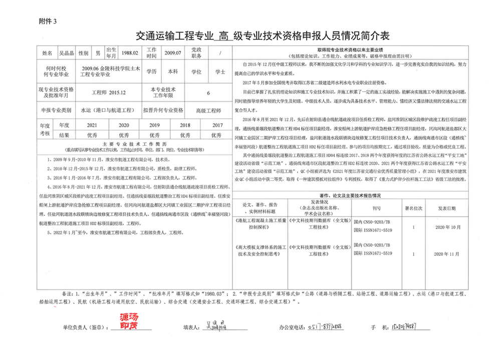 關于吳晶晶同志申報交通運輸工程水運(港口與航道工程)專業(yè)高級工程師的公…