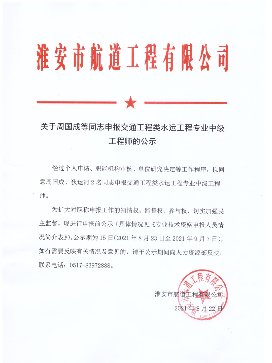 關于周國成等同志申報交通工程類水運工程專業(yè)中級工程師的公示
