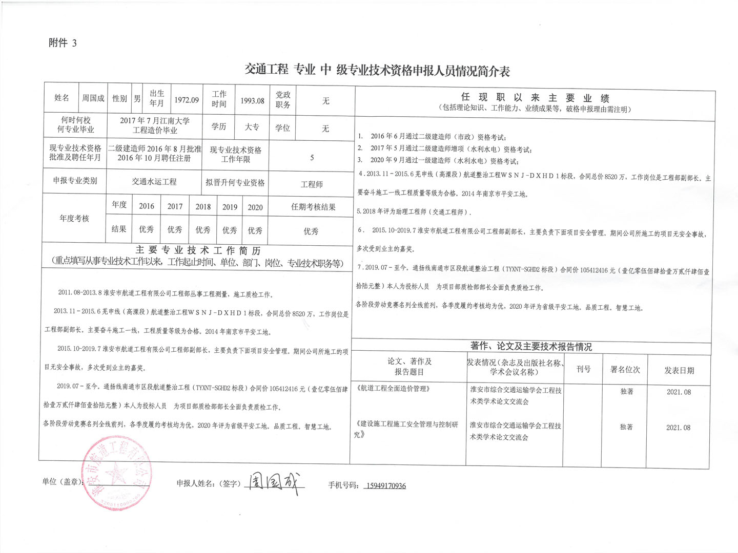 關(guān)于周國(guó)成等同志申報(bào)交通工程類水運(yùn)工程專業(yè)中級(jí)工程師的公示